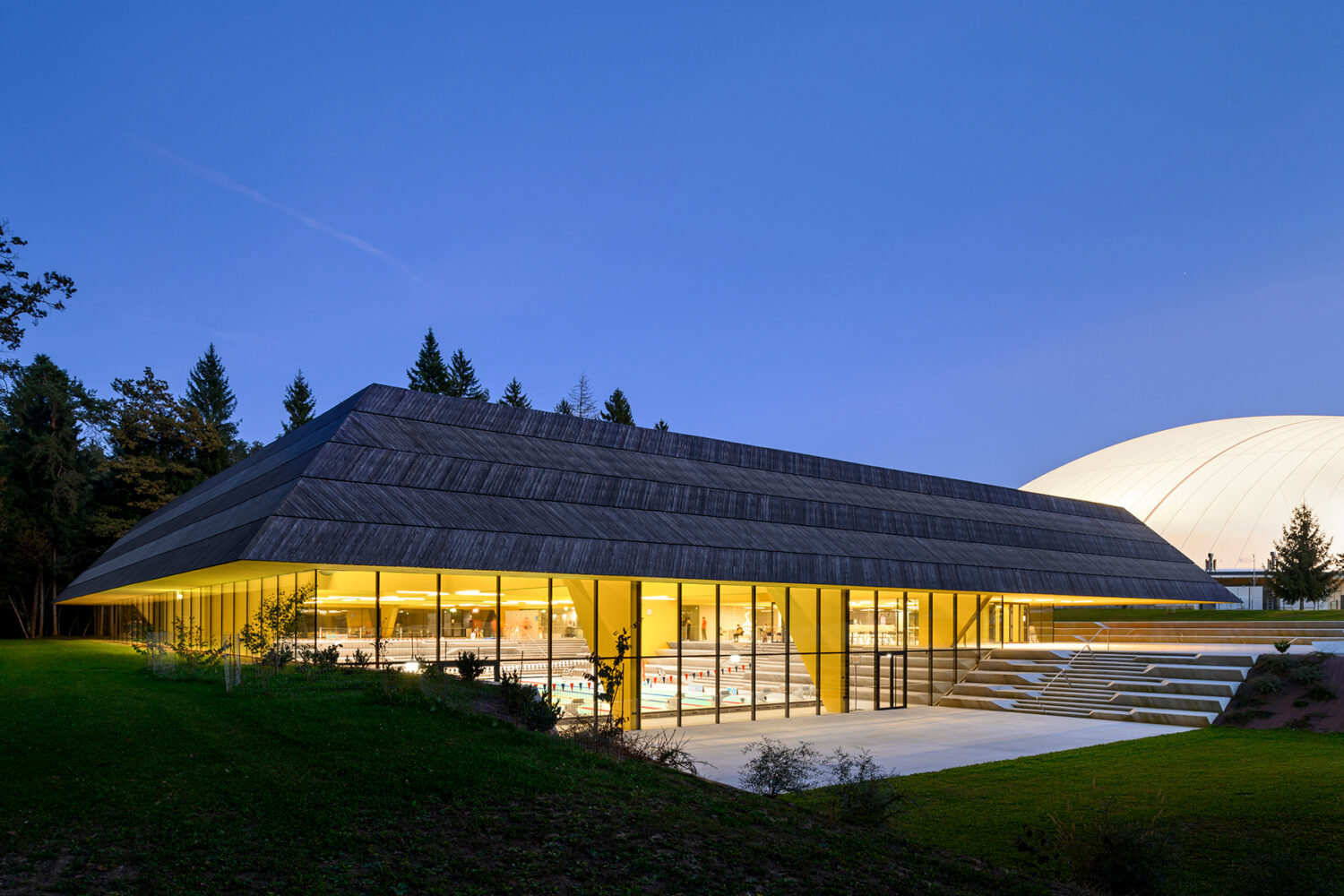 Kot da bi ta mandat vzeli res dobesedno, so avtorji novega kompleksa v Češči vasi posegli po najbolj arhetipskem odgovoru – geometrijsko čisto začrtani in z a la skodlami pokriti štirikapni masi. Masi, ki tudi najbolj laičnemu pogledu že od daleč jasno in brez cmoka v grlu pove: »Jaz sem streha.« Toda stavba že od trenutka, ko jo uzremo za belo opno velodroma, izpričuje smelost, kakršno v slovenski arhitekturi srečamo le poredko. Kot da bi jo preprostost koncepta osvobodila dvoma, se avtorska ekipa biroja Enota nikjer ne ustraši lastne ideje, nikjer ne zatakne pri nepotrebnih dodatkih ali zaplete pri odvečnih ambicijah.