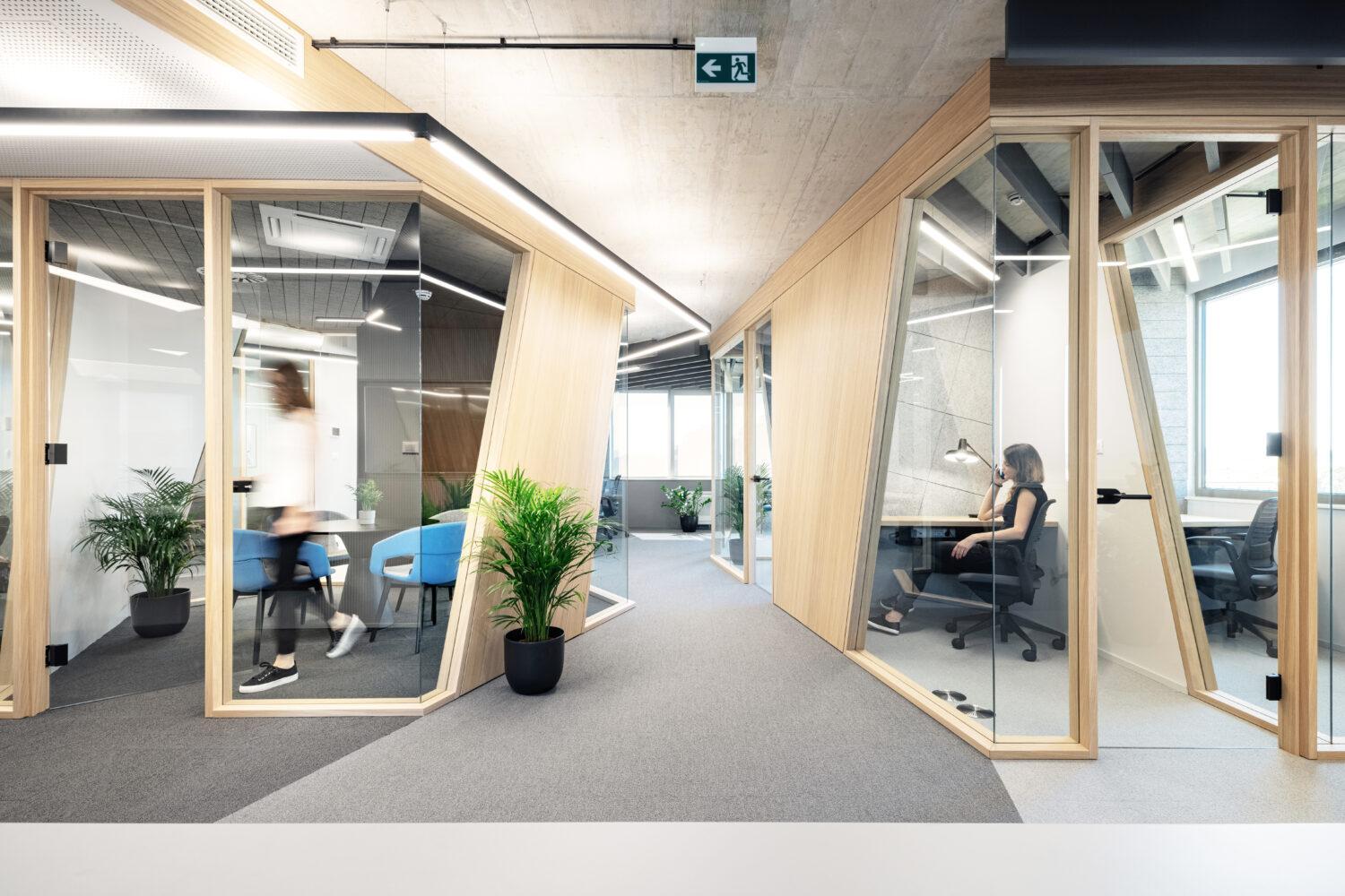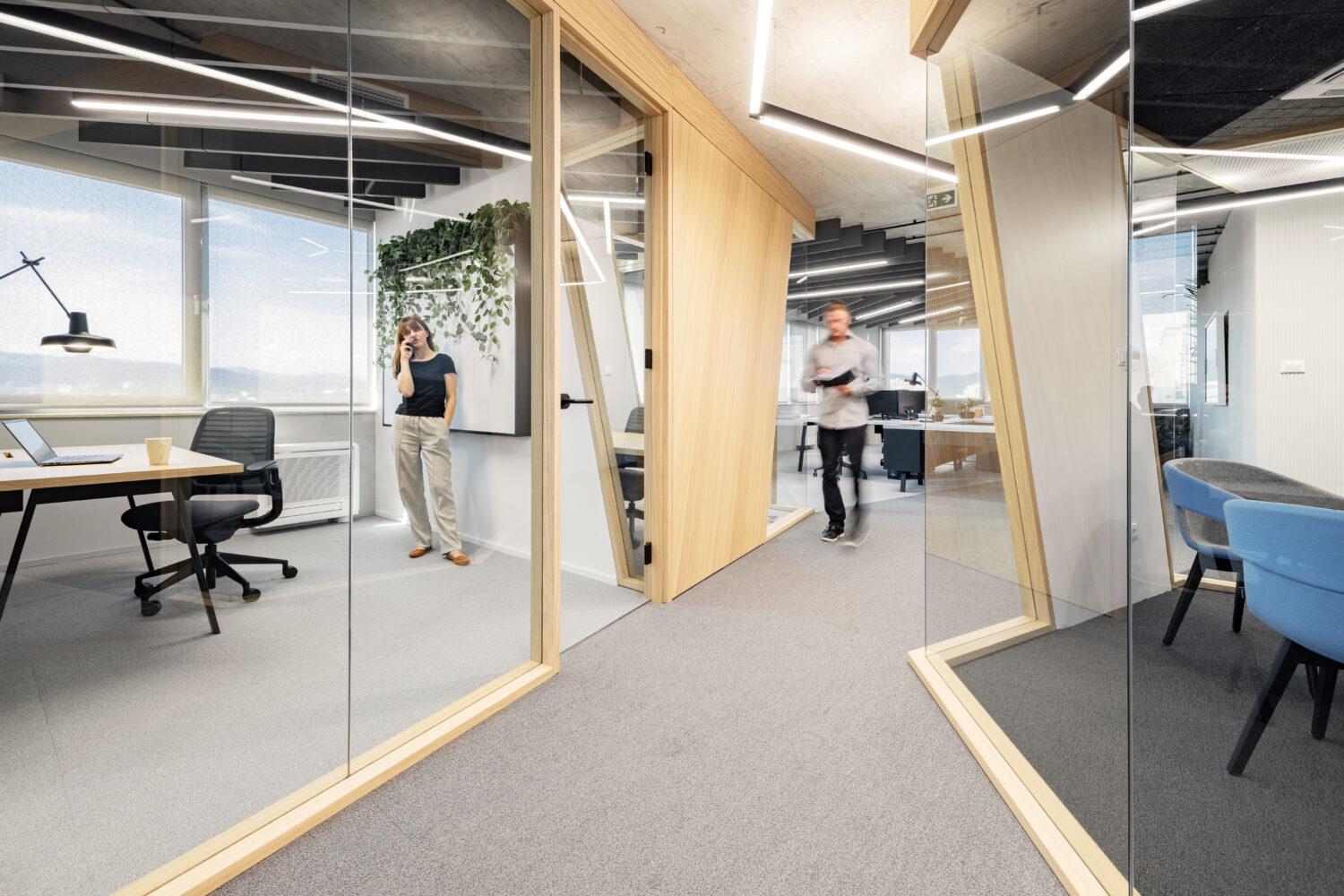 Pri oblikovanju osvetlitve smo se osredotočili zlasti na ustvarjalnost, produktivnost in dobro počutje zaposlenih. Optimalno splošno osvetlitev zagotavlja sistem linearnih svetlobnih elementov, umeščenih med stropne akustične panele. Komunikacijske poti so poudarjene s kontinuiranimi potezami v istem sistemu, ki hkrati čitljivo označujejo in osvetljujejo tokove gibanja. Delovna mesta pa točkovno osvetljujejo gibljive namizne in stenske svetilke znamke Grupa.